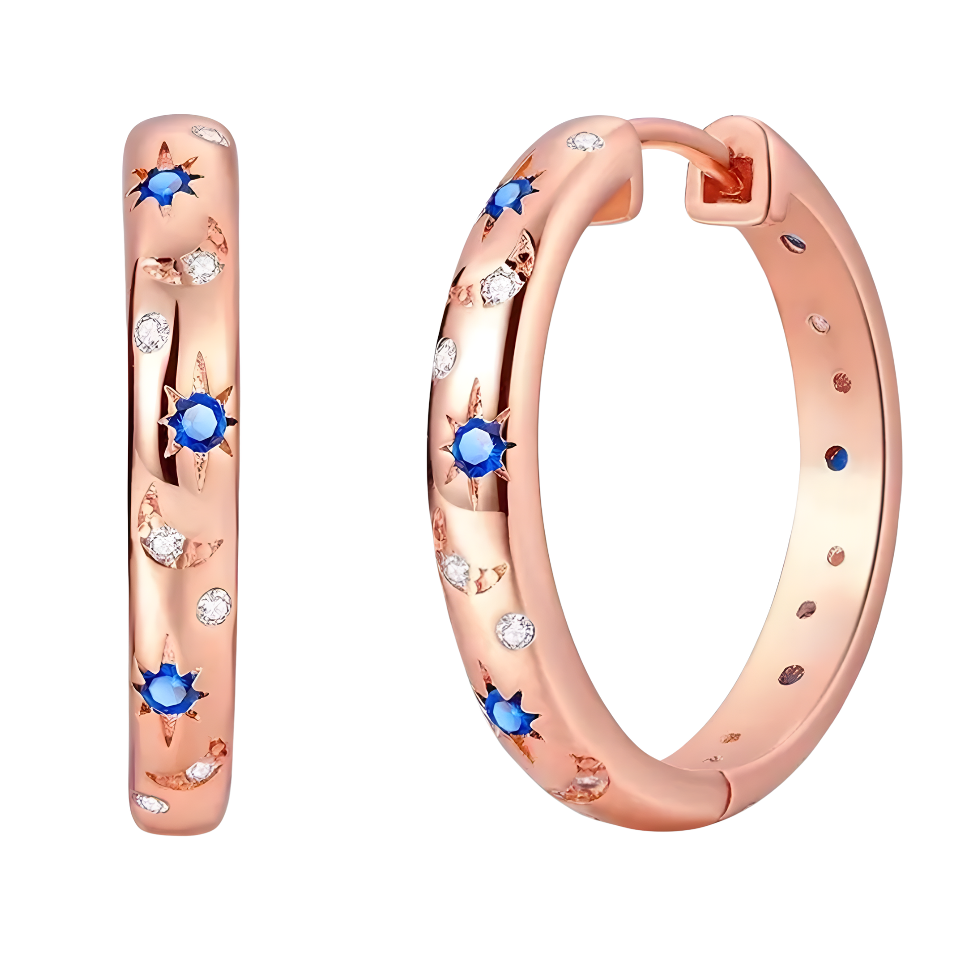 The lightweight construction and secure hinged closure ensure comfortable and reliable wear. The unique celestial theme and the eye-catching contrast between the deep sapphire blue, brilliant white, and the rosy gold metal make these earrings a standout piece. They are perfect for those who seek to add a playful, sophisticated, and on-trend accent to their daily rotation.