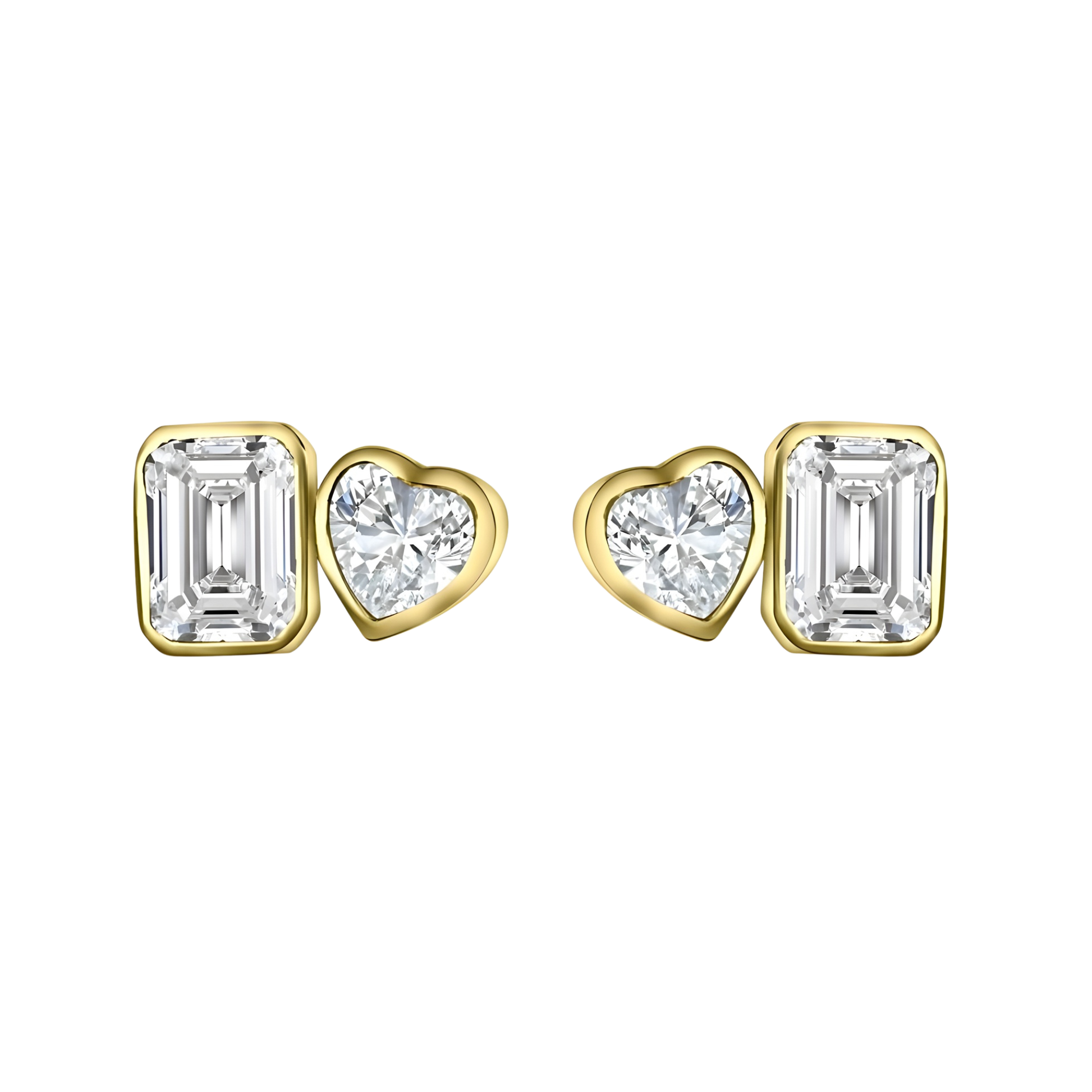 Each earring showcases a bezel-set baguette-cut cubic zirconia paired beautifully with a bezel-set heart-shaped CZ. The contrasting shapes create a refined balance between sophistication and sentiment, making these earrings a standout piece in any jewelry collection. The radiant gold vermeil finish enhances the brilliance of the stones, ensuring a luminous sparkle with every movement.