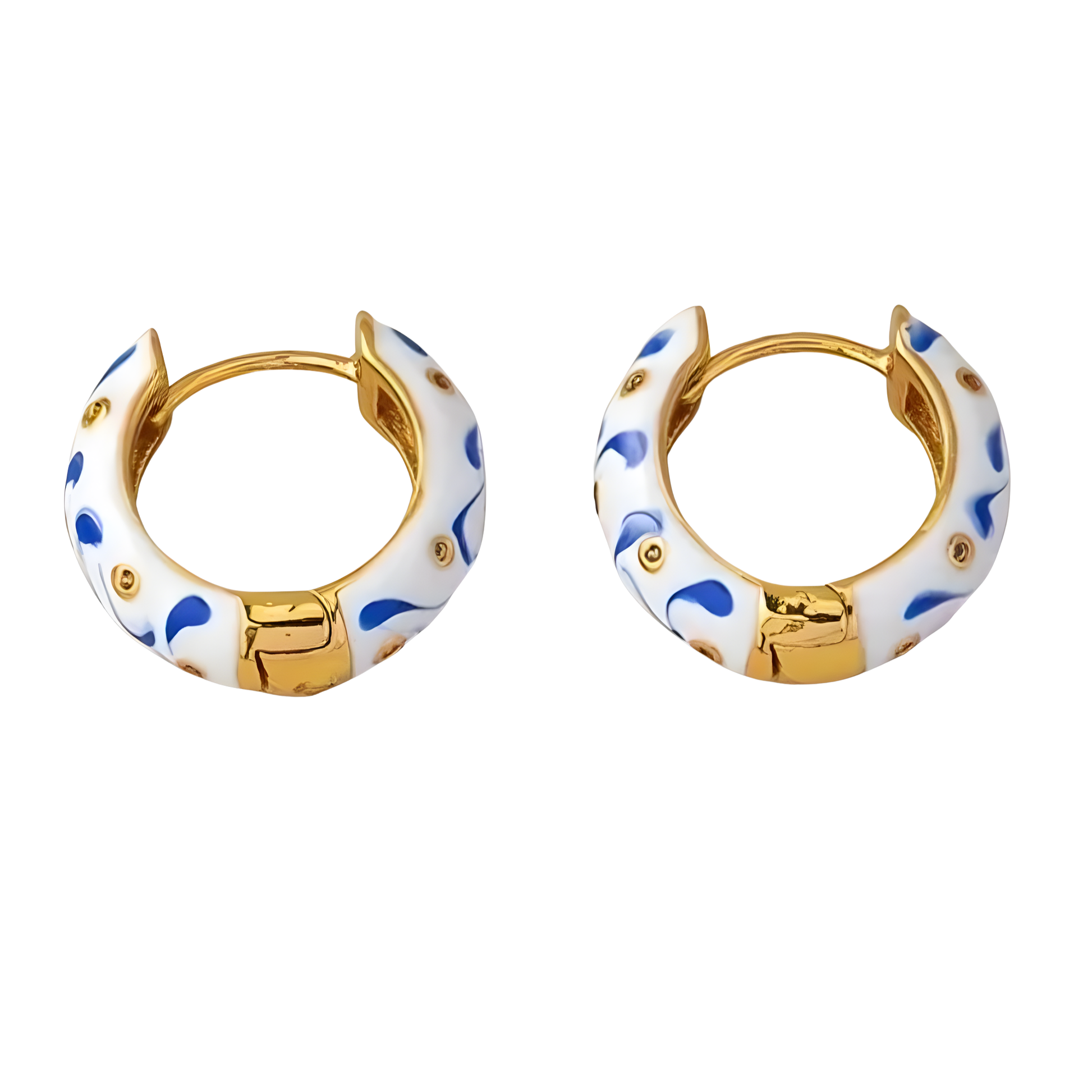 Inspired by traditional Spanish artistry, these Gold Plated Hand-Painted Enamel Huggie Hoops combine craftsmanship and contemporary flair. Each piece features intricate blue and white enamel detailing that evokes the charm of Mediterranean ceramics.