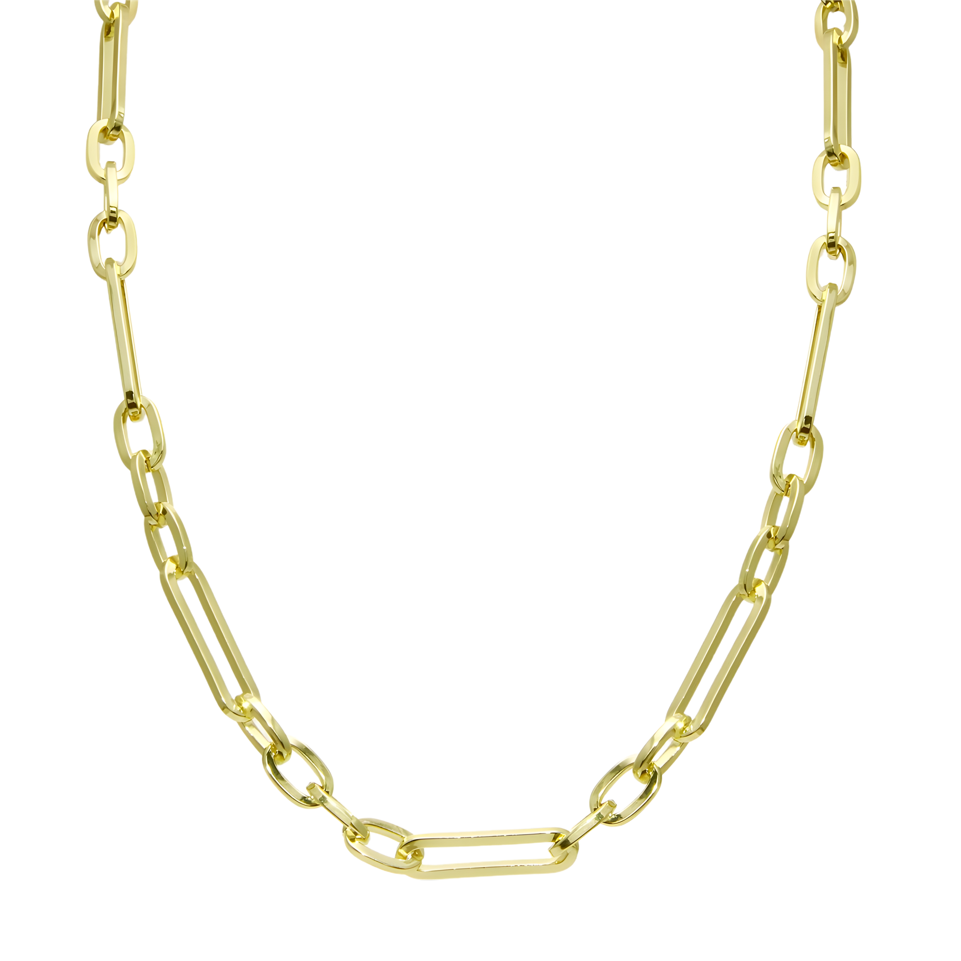 This substantial piece is expertly crafted with a base of fine metal, meticulously coated in rich 18K gold vermeil, ensuring a luxurious, enduring finish and a brilliant, warm gold tone. The design features a sequence of distinctive elongated, rounded-edge paperclip links, which provides a sleek, architectural rhythm that is both modern and timeless. Each link is polished to a high shine, offering exceptional light reflectivity and perceived value.