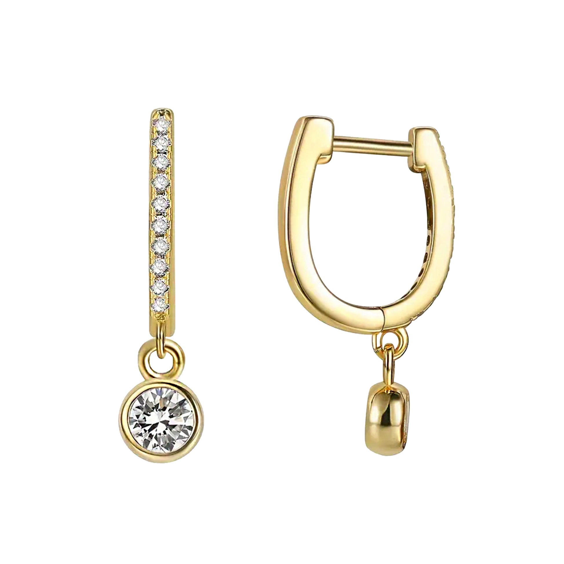 Exquisite Craftsmanship Crafted in high-quality gold vermeil over stainless steel, each earring is designed to shine brightly and last. The front of the hoop is lined with micro-pavé stones for a subtle shimmer, complementing the larger solitaire-style drop below. The smooth bezel setting enhances the brilliance of the stone while keeping the design clean and modern.