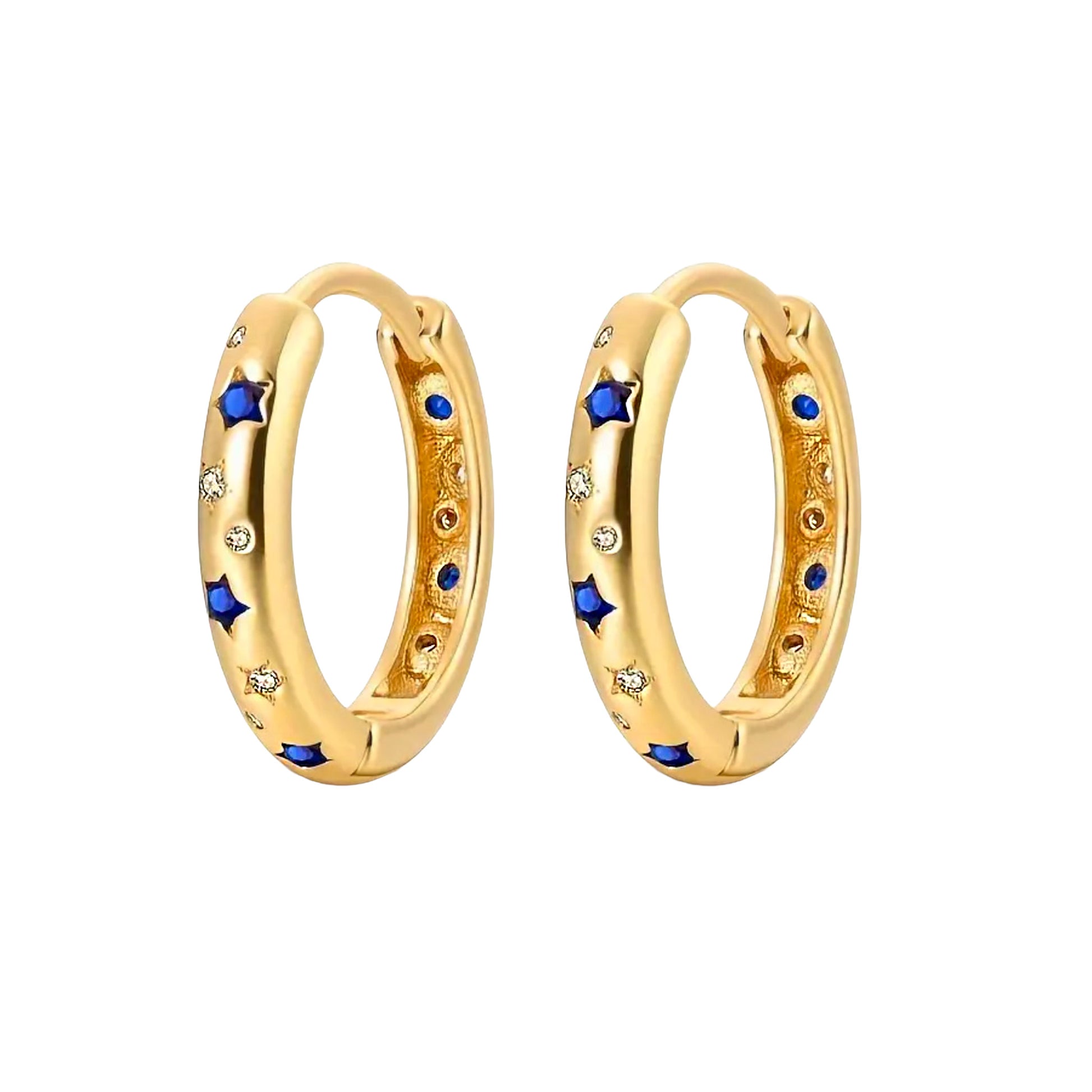 Crafted in premium 18k gold vermeil over solid sterling silver, these hoops are made to shine for years. The star-shaped settings are carefully faceted to hold rich blue stones that reflect light just like a midnight constellation. Micro-set white crystals add the perfect finishing sparkle, giving each hoop a dimensional, luxe look.