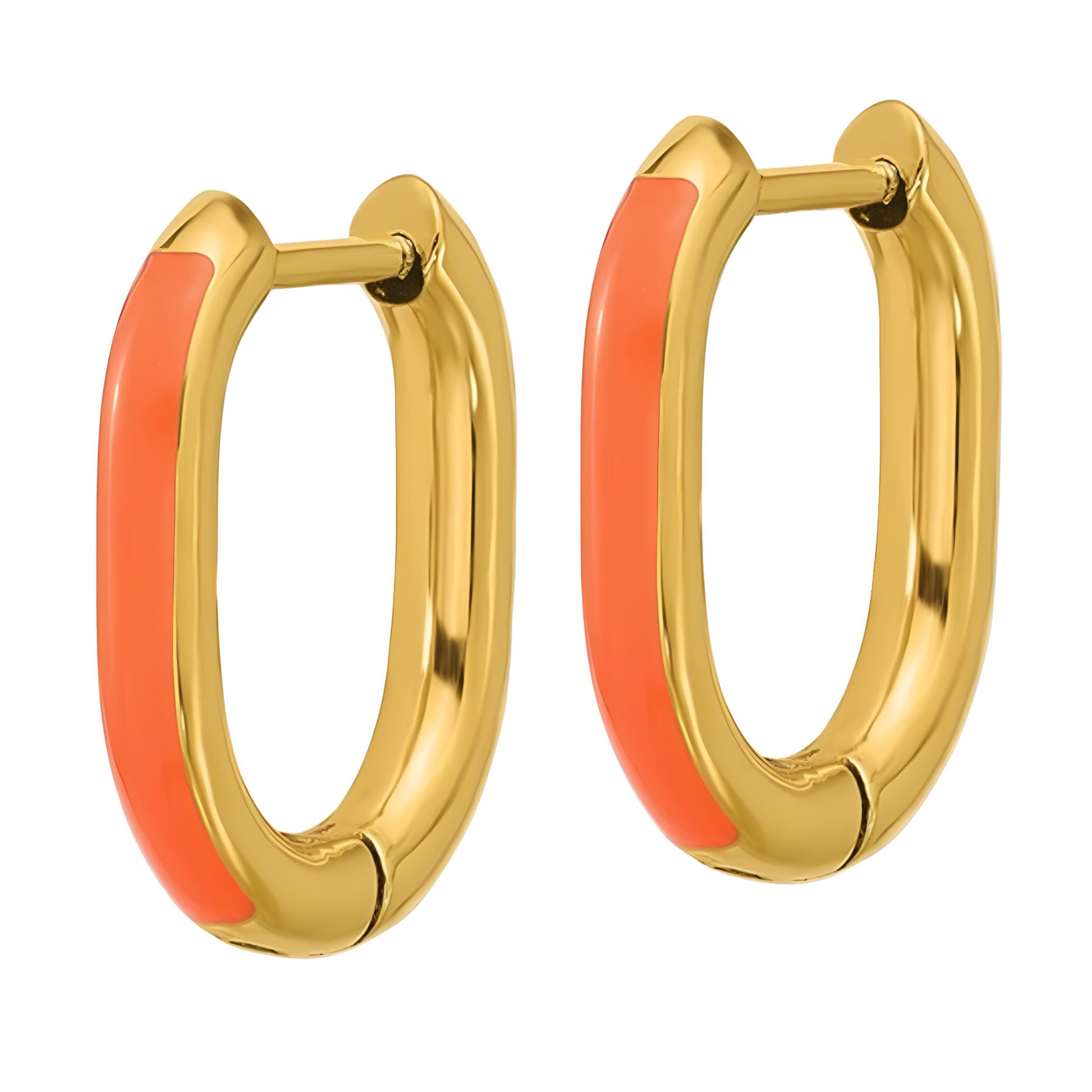 Bring warmth and style to your look with the 14K Gold & Hypoallergenic Stainless Steel Orange Enamel Oval Hoop Earrings. The radiant orange enamel delivers a bold yet refined pop of color, perfectly complemented by the gleaming 14K gold finish for a modern, fashion-forward statement.