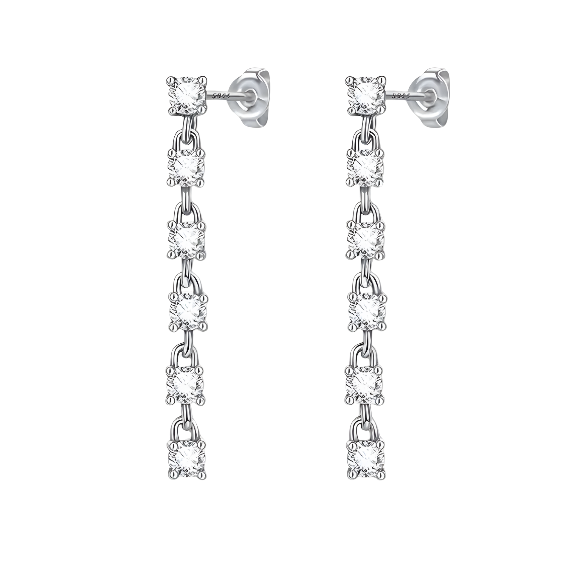 Elegant Design Featuring a cascading line of brilliant round-cut cubic zirconia stones, these earrings shimmer beautifully with every turn of your head. The delicate drop silhouette adds a graceful flow, perfect for special occasions or elevating an evening look.
